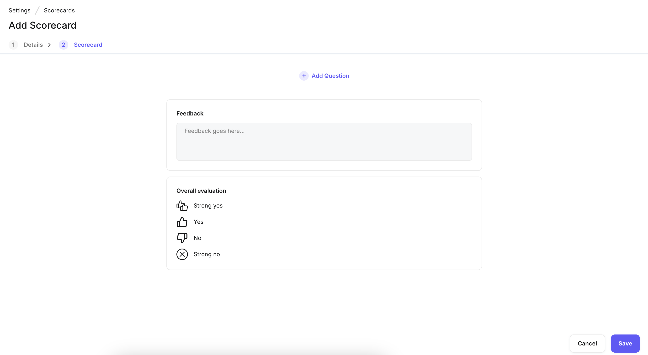 Scorecards play a critical role in collecting feedback from interviewers, helping recruiters and hiring managers make data-driven hiring decisions. It's best to create role-specific, location-specific, or work-type-specific feedback forms and link them to interview plans to standardize evaluations.