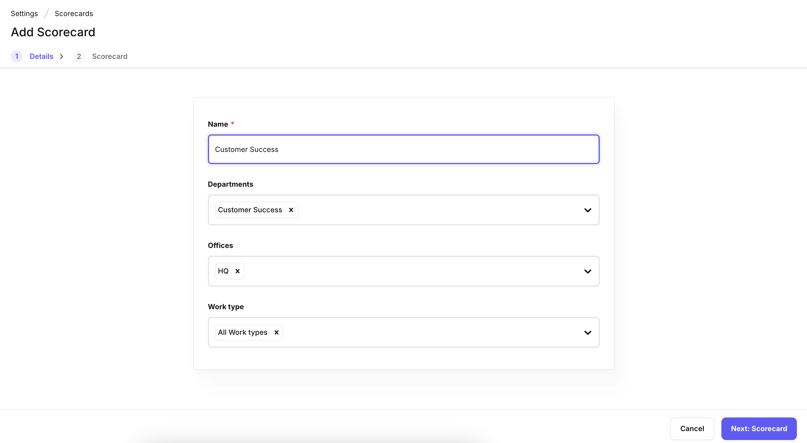 Department and Office Selection: Scorecards are linked to specific configurations. For example, if you create a scorecard and select Department: Engineering and Office: Bangalore, this scorecard will automatically be fetched for any job created with that same department and office configuration.