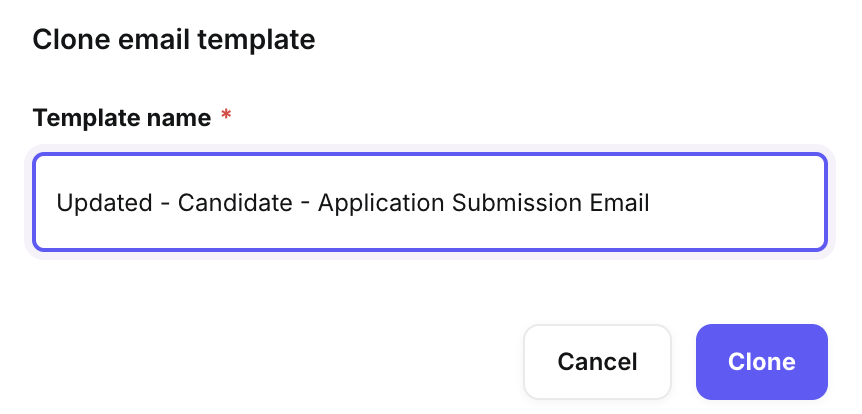 You can clone a template by simply clicking on the Ellipsis (...) icon that appears when you hover over the respective section on the Templates homepage > Click on the Clone option > Update the Template Name field according to your needs > Complete the action by clicking on the Clone button.