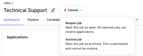 Next to the job title, you will see a button that displays the current status of the job (which should read "Closed"). Click on this status button, and a dropdown menu will appear. From this menu, select the "Reopen job" option.