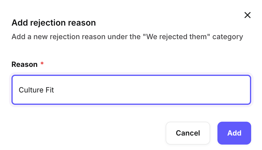Click Add to save the new rejection reason. It will be enabled by default on the Rejection Reasons homepage.