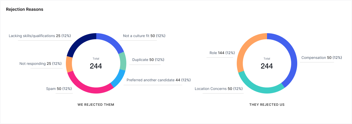 Rejected Reasons (We Rejected Them): A pie chart that categorizes the reasons your organization decided to reject candidates. This visualization helps you analyze the most common reasons for rejections, enabling you to refine your screening criteria.