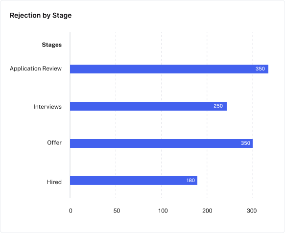 Rejection by Stage: A bar chart that breaks down rejections by the stage of the recruitment process where they occurred. This visualization highlights potential drop-off points and helps you identify stages where candidates are more likely to be rejected.