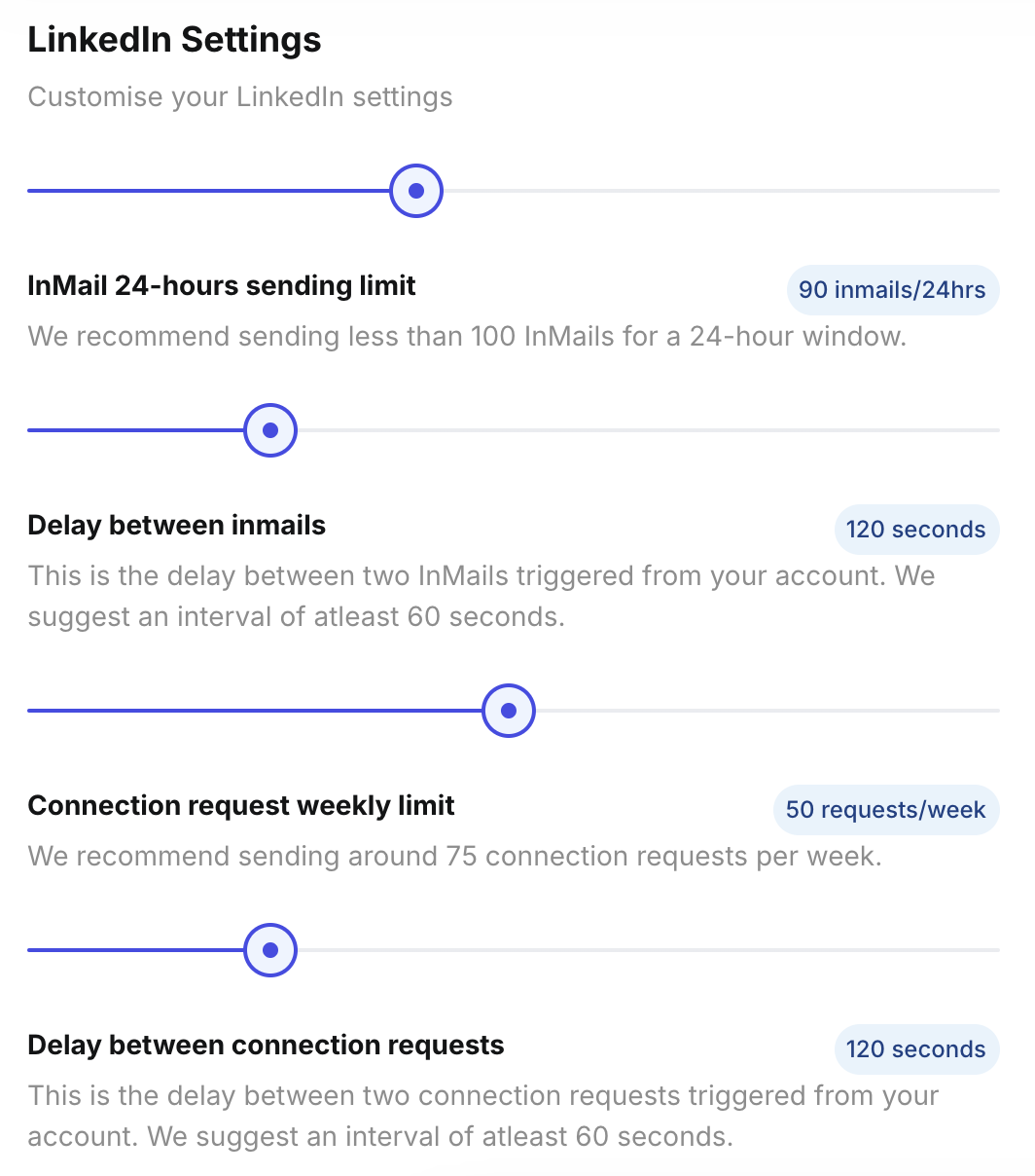 Ensure that you set the optimum "24-Hour Sending Limit" and the "Delay Between" parameters for InMails, and similarly set the optimum "Weekly Limit" and the "Delay Between" parameters for Connection Requests.