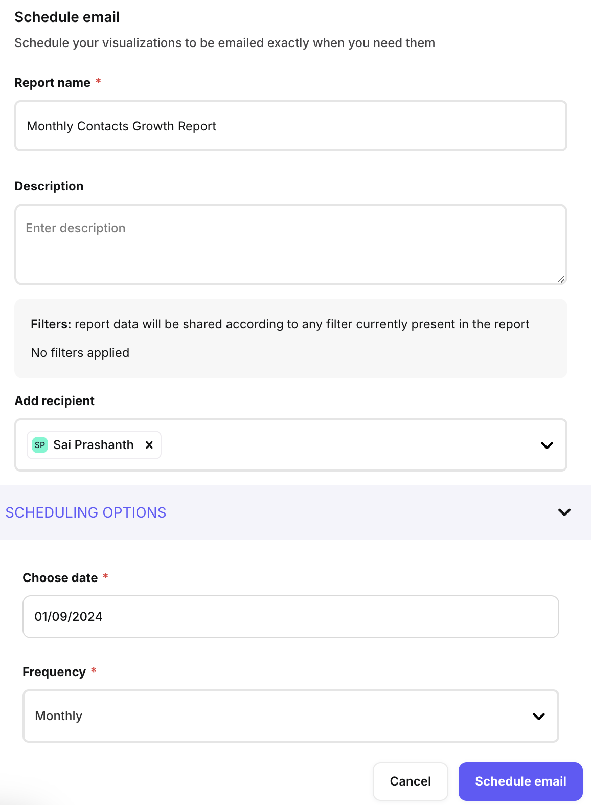 Schedule Email Reports: Automate report distribution by selecting recipients, setting frequency, and defining the delivery time.