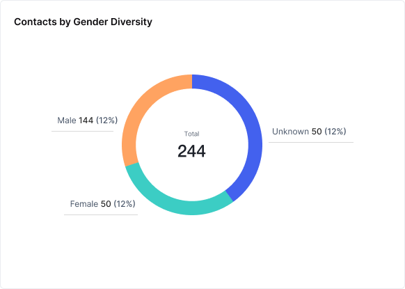 Contacts by Gender Diversity: A pie chart illustrating gender distribution provides insights into the diversity of your contact pool.