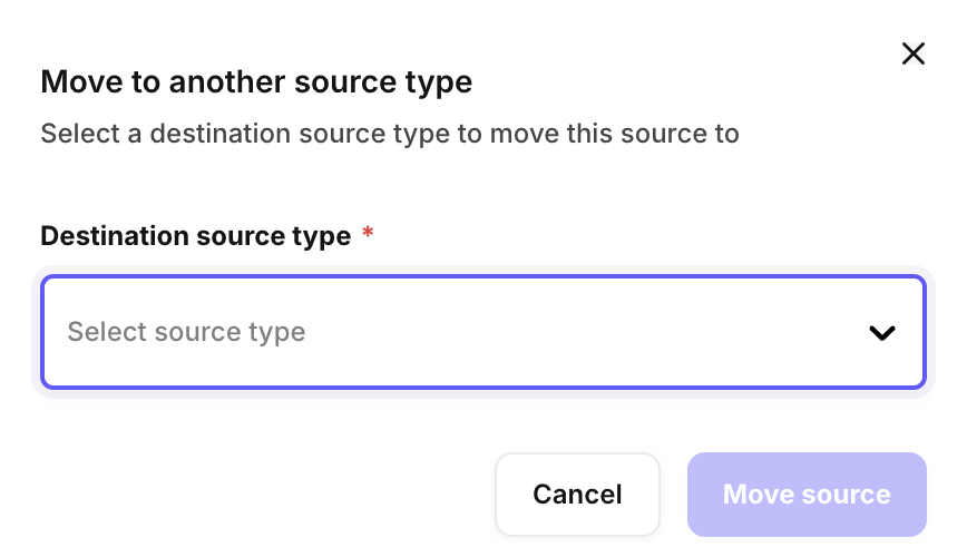 To move a source, hover over the source on the Candidate Sources homepage and click the Move icon. You’ll then be prompted to reassign it to a new source type. Click on the Move source button to complete.