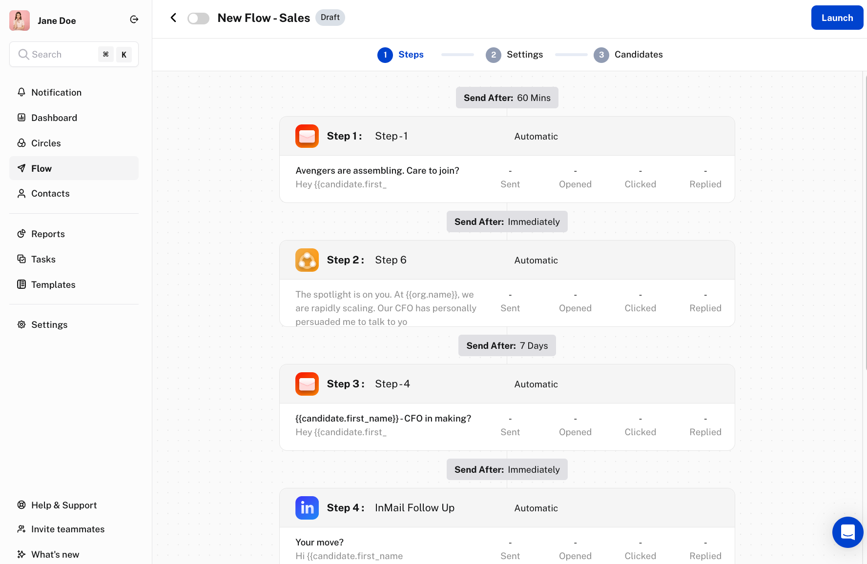 Kula Flows lets you automate reach-outs and engagement with candidates. Each Kula Flow is a combination of one or more steps. A step is either a message or an action.