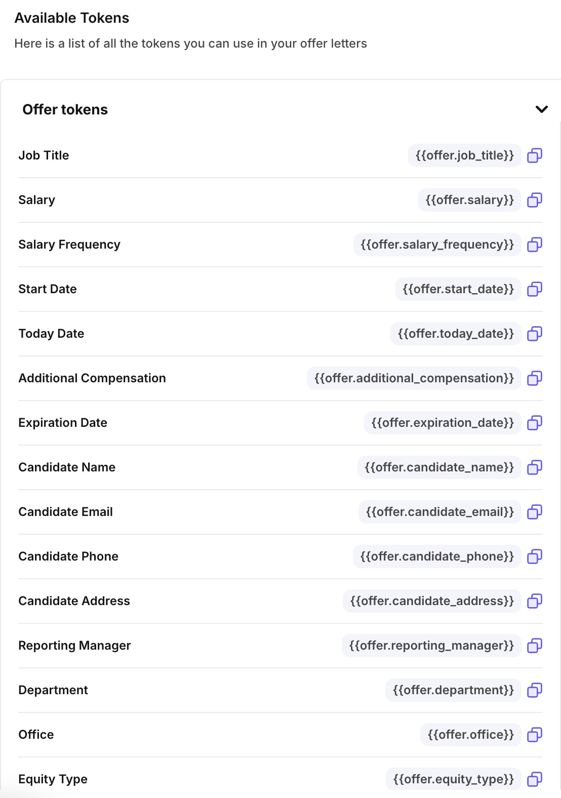 .docxformat.For reference, you can click on the "View Tokens" button, located next to "Add Offer Template," and incorporate placeholders into your template.