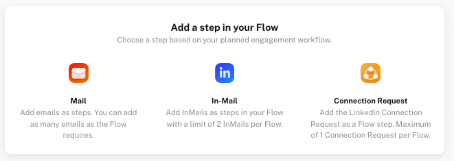 Select Communication ChannelBegin by selecting the desired communication channel for the flow step. Kula offers three options: Email, LinkedIn InMail, and LinkedIn Connection Request. Choose the appropriate channel based on your communication strategy and the preferences of your target audience.