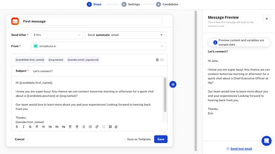 Kula's true multichannel outreach, encompassing Email, LinkedIn InMail, and LinkedIn Connection Request capabilities, is a powerful tool that enables effective engagement with potential candidates.