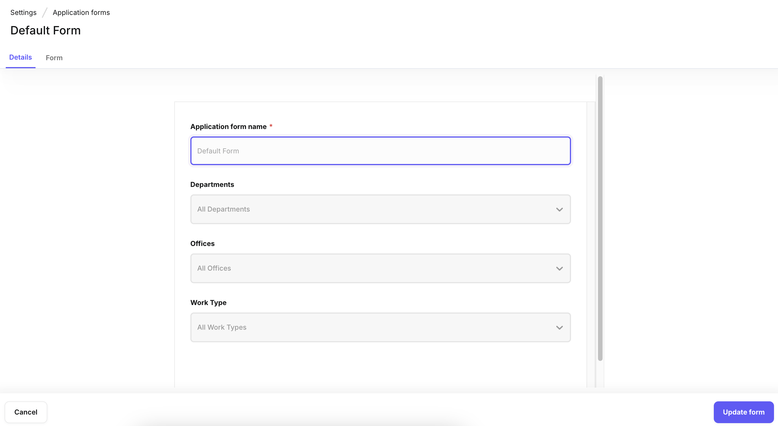 Note: These fields cannot be edited in the default form. The "Departments," "Offices," and "Work Type" are automatically mapped to all available categories.