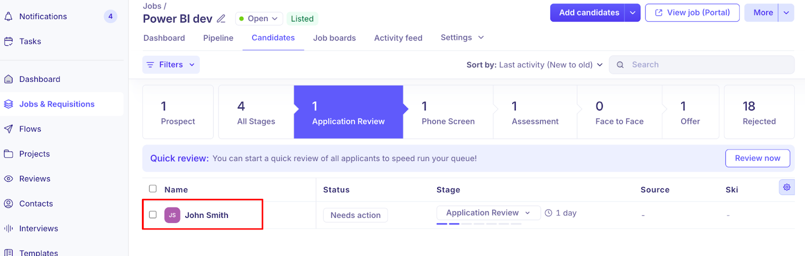Open Profile: Navigate to the Jobs > Candidates > select the Candidate.