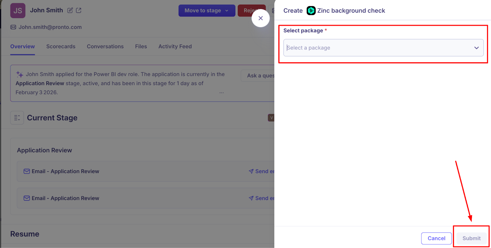 Create Zinc background check: Select your package from a dropdown of packages synced directly from your Zinc account → Click “Submit” → You will see a message - “Zinc background check sent successfully”.