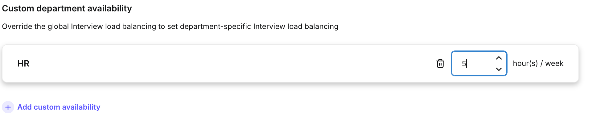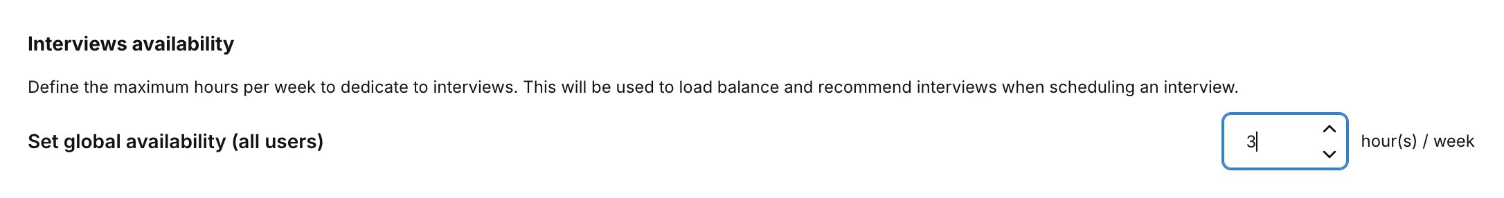 Administrators can configure the maximum number of interview hours per week for users, helping to manage the time spent on interviews and distribute the workload evenly. This setting is used to recommend the best available interviewer when scheduling interviews.