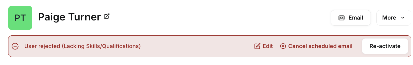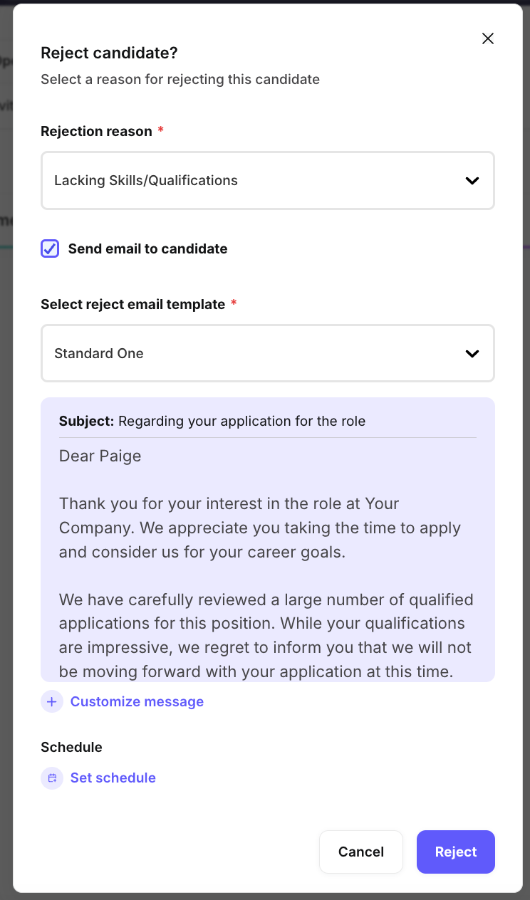 Once the email is scheduled, the candidate’s status will be marked as Rejected.