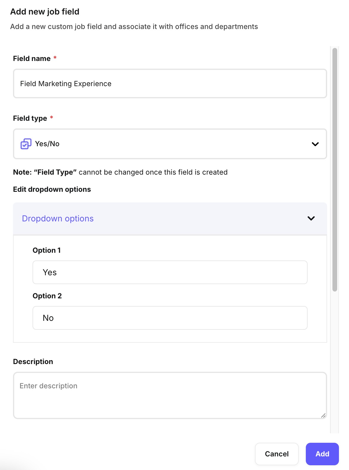 If you want the field to be mandatory during job creation, check the "Required Field" box.