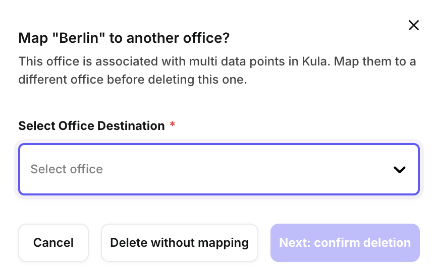 To delete an office location, hover over the section on the Offices homepage and click the Delete icon. You will then be prompted to either map the location to a new destination or complete the deletion without mapping.
