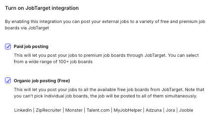 JobTarget: This option allows you to post jobs to multiple job boards. Note that some job boards require a fee.